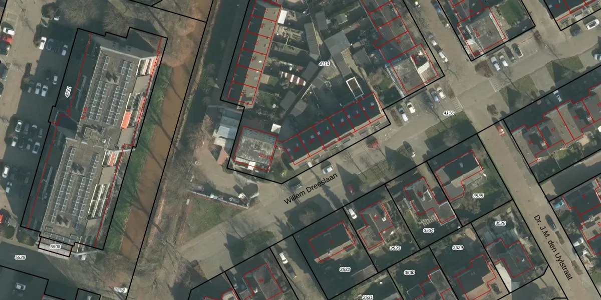 Het perceel waarop Willem Dreeslaan 108 staat heeft een oppervlakte van 4030 m². Dit is een zeer groot perceel. De perceeloppervlakte wordt geregistreerd door het Kadaster. Gedetailleerde informatie over de maten van dit perceel kunt u vinden in het rapport Kadastrale kaart met maatvoering van Willem Dreeslaan 108.