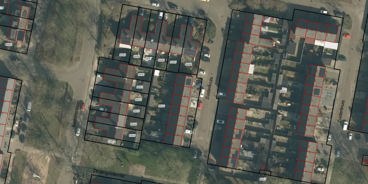 Het perceel waarop Zuiderkruis 16 staat heeft een oppervlakte van 1059 m². Dit is een zeer groot perceel. De perceeloppervlakte wordt geregistreerd door het Kadaster. Gedetailleerde informatie over de maten van dit perceel kunt u vinden in het rapport Kadastrale kaart met maatvoering van Zuiderkruis 16.