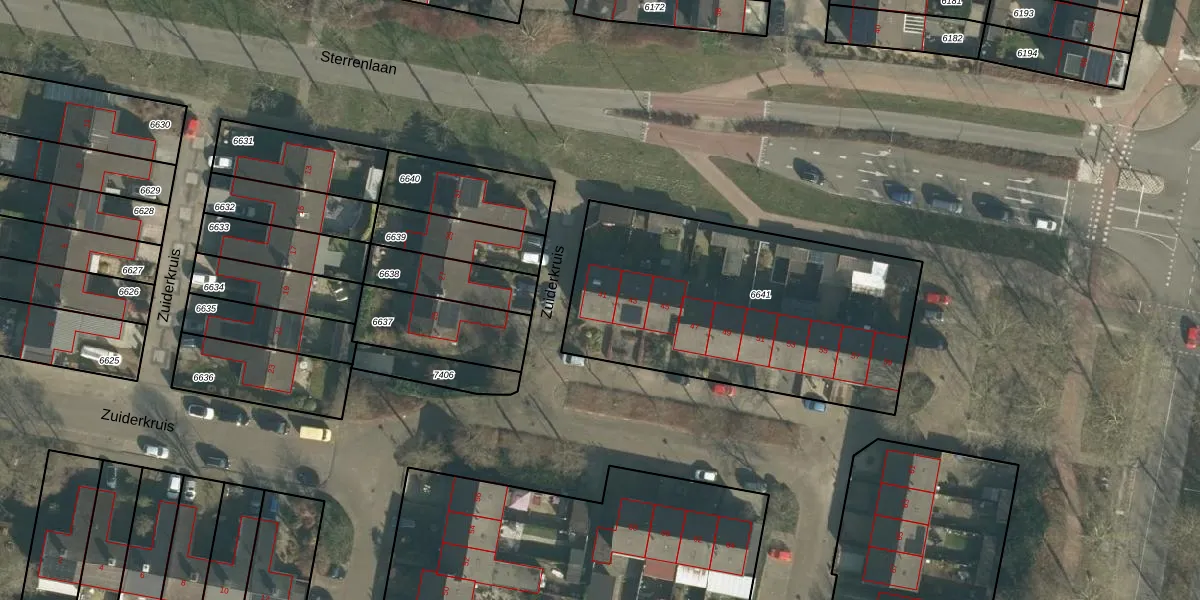 Het perceel waarop Zuiderkruis 41 staat heeft een oppervlakte van 1470 m². Dit is een zeer groot perceel. De perceeloppervlakte wordt geregistreerd door het Kadaster. Gedetailleerde informatie over de maten van dit perceel kunt u vinden in het rapport Kadastrale kaart met maatvoering van Zuiderkruis 41.