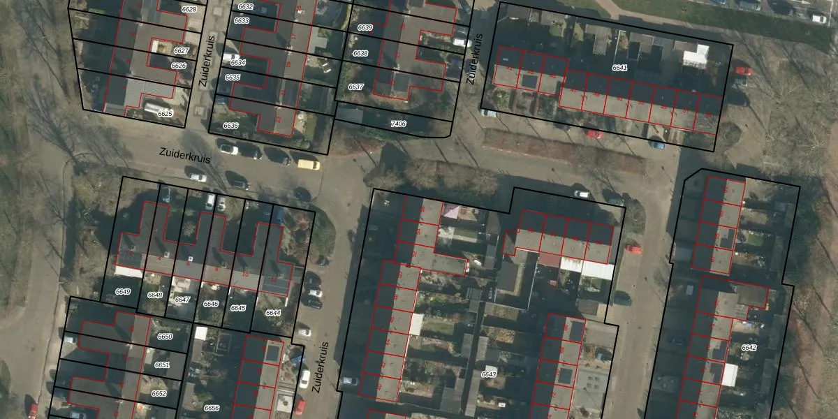 Het perceel waarop Zuiderkruis 56 staat heeft een oppervlakte van 5490 m². Dit is een zeer groot perceel. De perceeloppervlakte wordt geregistreerd door het Kadaster. Gedetailleerde informatie over de maten van dit perceel kunt u vinden in het rapport Kadastrale kaart met maatvoering van Zuiderkruis 56.