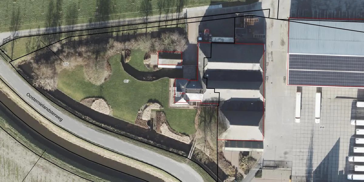 Het perceel waarop Oosternielandsterweg 9-B staat heeft een oppervlakte van 5865 m². Dit is een zeer groot perceel. De perceeloppervlakte wordt geregistreerd door het Kadaster. Gedetailleerde informatie over de maten van dit perceel kunt u vinden in het rapport Kadastrale kaart met maatvoering van Oosternielandsterweg 9-B.