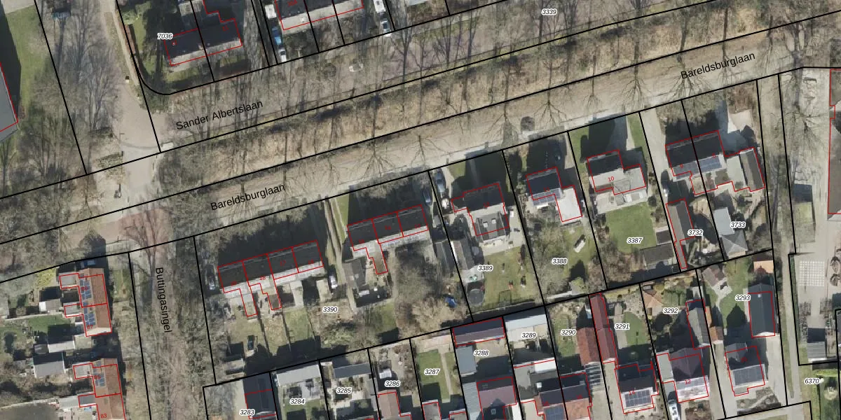 Het perceel waarop Bareldsburglaan 13 staat heeft een oppervlakte van 2214 m². Dit is een zeer groot perceel. De perceeloppervlakte wordt geregistreerd door het Kadaster. Gedetailleerde informatie over de maten van dit perceel kunt u vinden in het rapport Kadastrale kaart met maatvoering van Bareldsburglaan 13.