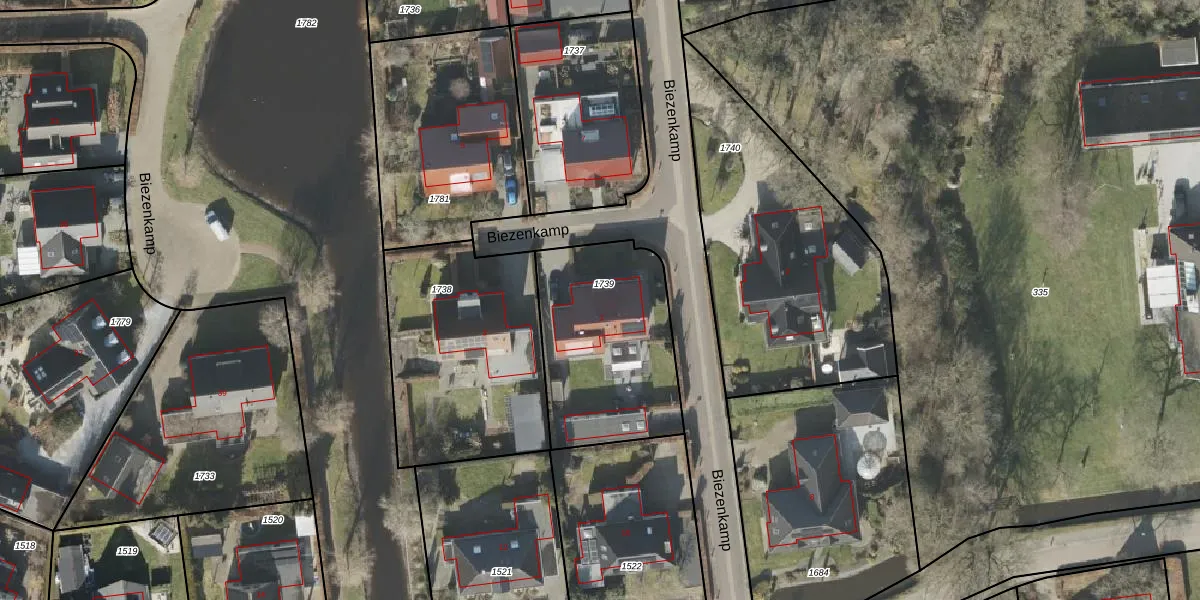Biezenkamp 1 is gelegen op kadastraal perceel OTW02D1739. Deze kadastrale aanduiding is uniek en wordt gebruikt door het Kadaster om eigendomsrechten en andere zakelijke rechten vast te leggen. Het perceel maakt onderdeel uit van de kadastrale gemeente Oosterwolde.