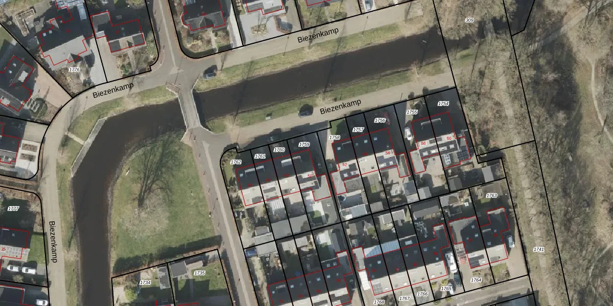 Het perceel waarop Biezenkamp 50 staat heeft een oppervlakte van 313 m². Dit is een groot perceel. De perceeloppervlakte wordt geregistreerd door het Kadaster. Gedetailleerde informatie over de maten van dit perceel kunt u vinden in het rapport Kadastrale kaart met maatvoering van Biezenkamp 50.