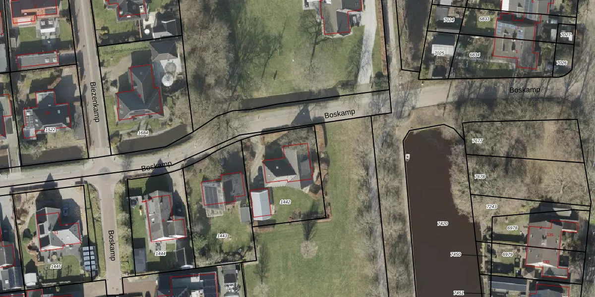 Het perceel waarop Boskamp 1 staat heeft een oppervlakte van 767 m². Dit is een groot perceel. De perceeloppervlakte wordt geregistreerd door het Kadaster. Gedetailleerde informatie over de maten van dit perceel kunt u vinden in het rapport Kadastrale kaart met maatvoering van Boskamp 1.