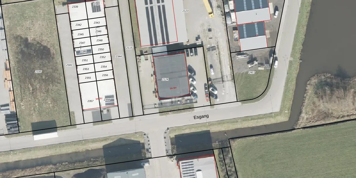 Esgang 5-H is gelegen op kadastraal perceel OTW02D2124. Deze kadastrale aanduiding is uniek en wordt gebruikt door het Kadaster om eigendomsrechten en andere zakelijke rechten vast te leggen. Het perceel maakt onderdeel uit van de kadastrale gemeente Oosterwolde.