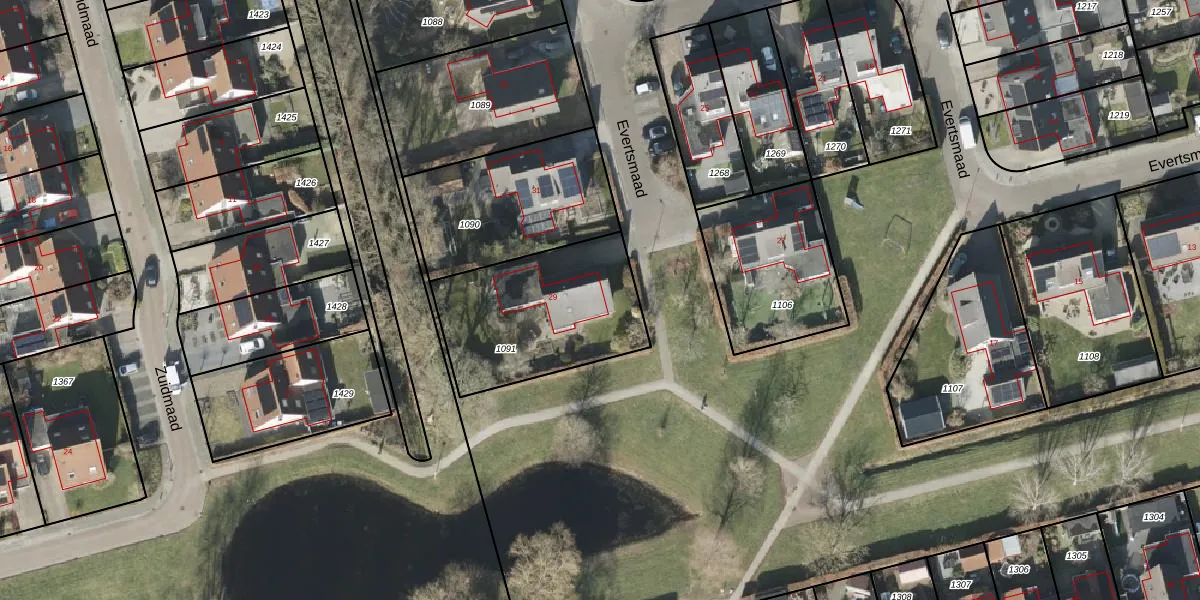 Het perceel waarop Evertsmaad 29 staat heeft een oppervlakte van 657 m². Dit is een groot perceel. De perceeloppervlakte wordt geregistreerd door het Kadaster. Gedetailleerde informatie over de maten van dit perceel kunt u vinden in het rapport Kadastrale kaart met maatvoering van Evertsmaad 29.