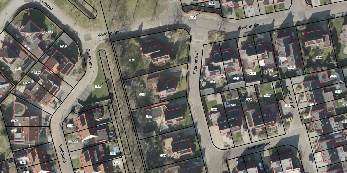 Het perceel waarop Evertsmaad 39 staat heeft een oppervlakte van 640 m². Dit is een groot perceel. De perceeloppervlakte wordt geregistreerd door het Kadaster. Gedetailleerde informatie over de maten van dit perceel kunt u vinden in het rapport Kadastrale kaart met maatvoering van Evertsmaad 39.
