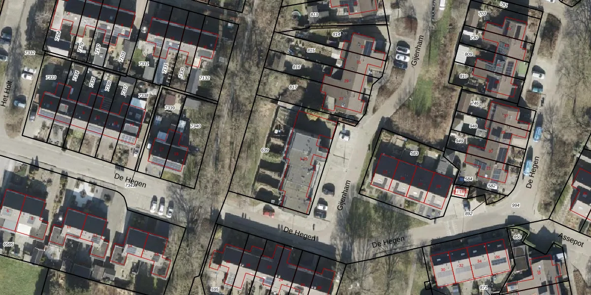 Het perceel waarop Gijenham 5 staat heeft een oppervlakte van 1015 m². Dit is een zeer groot perceel. De perceeloppervlakte wordt geregistreerd door het Kadaster. Gedetailleerde informatie over de maten van dit perceel kunt u vinden in het rapport Kadastrale kaart met maatvoering van Gijenham 5.
