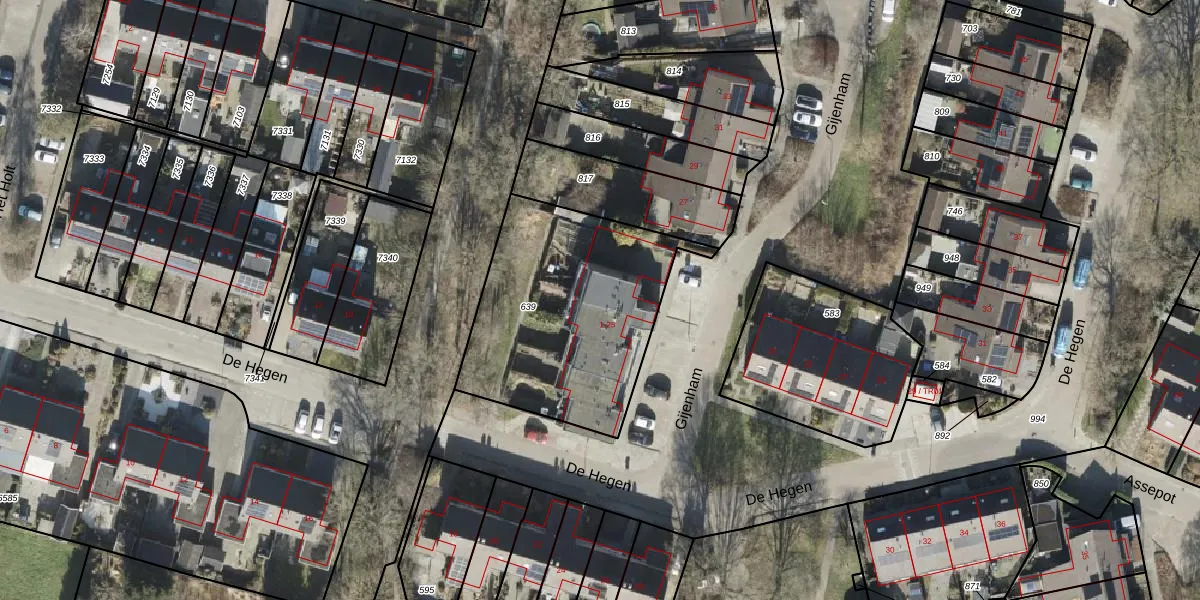 Het perceel waarop Gijenham 9 staat heeft een oppervlakte van 1015 m². Dit is een zeer groot perceel. De perceeloppervlakte wordt geregistreerd door het Kadaster. Gedetailleerde informatie over de maten van dit perceel kunt u vinden in het rapport Kadastrale kaart met maatvoering van Gijenham 9.
