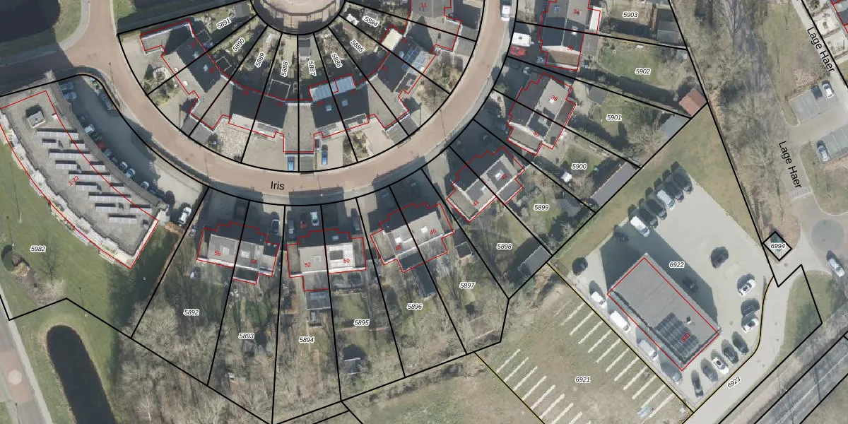 Het perceel waarop Iris 46 staat heeft een oppervlakte van 510 m². Dit is een groot perceel. De perceeloppervlakte wordt geregistreerd door het Kadaster. Gedetailleerde informatie over de maten van dit perceel kunt u vinden in het rapport Kadastrale kaart met maatvoering van Iris 46.