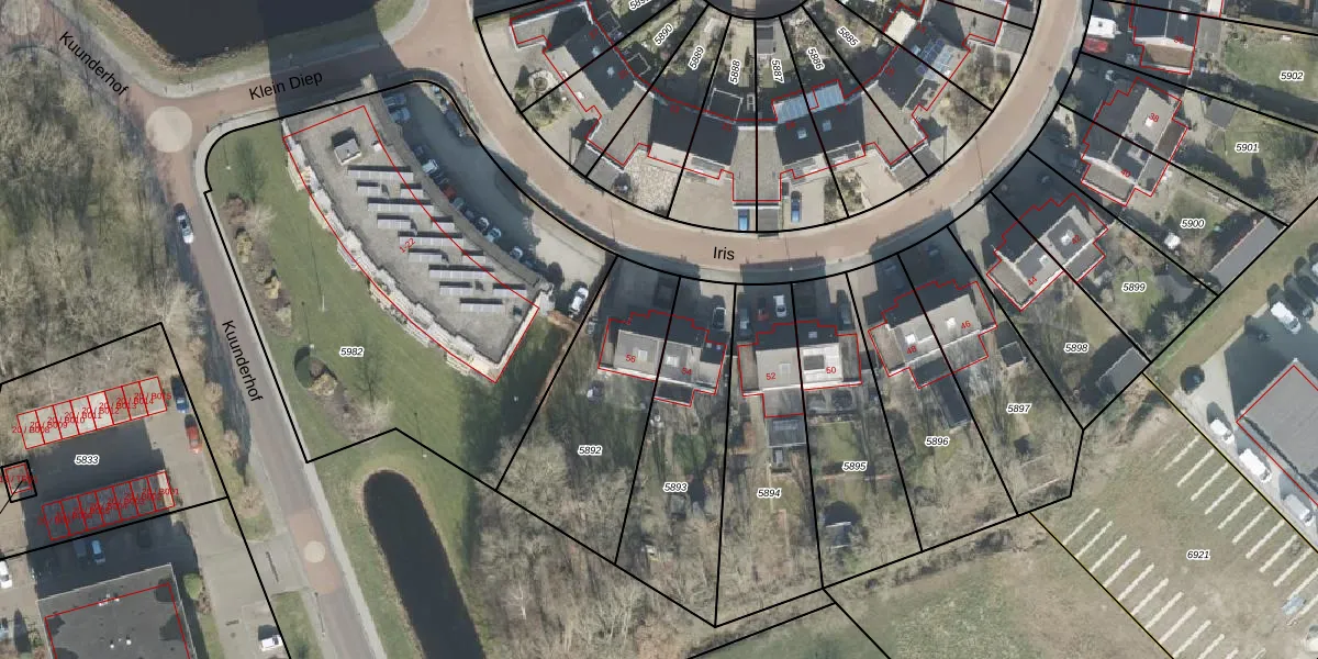 Iris 56 is gelegen op kadastraal perceel OTW02C5892. Deze kadastrale aanduiding is uniek en wordt gebruikt door het Kadaster om eigendomsrechten en andere zakelijke rechten vast te leggen. Het perceel maakt onderdeel uit van de kadastrale gemeente Oosterwolde.