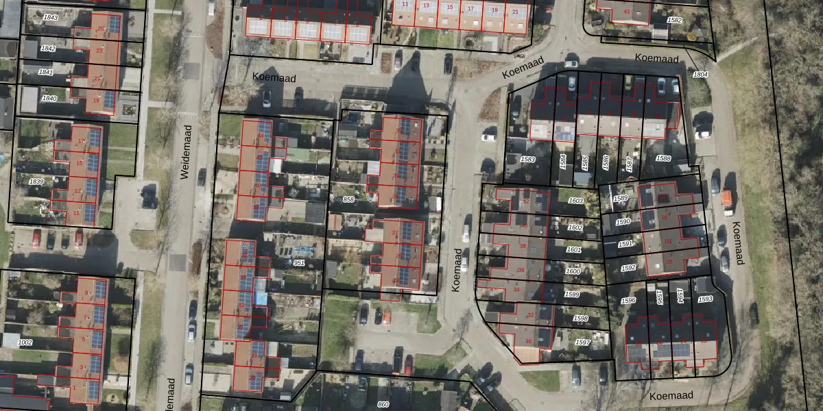 Het perceel waarop Koemaad 29 staat heeft een oppervlakte van 1210 m². Dit is een zeer groot perceel. De perceeloppervlakte wordt geregistreerd door het Kadaster. Gedetailleerde informatie over de maten van dit perceel kunt u vinden in het rapport Kadastrale kaart met maatvoering van Koemaad 29.