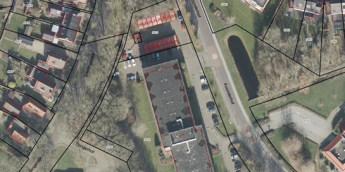 Het perceel waarop Kuunderhof 114 staat heeft een oppervlakte van 5622 m². Dit is een zeer groot perceel. De perceeloppervlakte wordt geregistreerd door het Kadaster. Gedetailleerde informatie over de maten van dit perceel kunt u vinden in het rapport Kadastrale kaart met maatvoering van Kuunderhof 114.