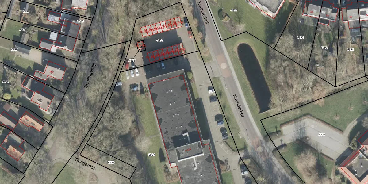 Het perceel waarop Kuunderhof 14 staat heeft een oppervlakte van 5622 m². Dit is een zeer groot perceel. De perceeloppervlakte wordt geregistreerd door het Kadaster. Gedetailleerde informatie over de maten van dit perceel kunt u vinden in het rapport Kadastrale kaart met maatvoering van Kuunderhof 14.
