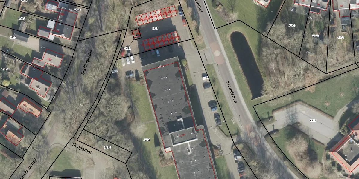 Het perceel waarop Kuunderhof 43 staat heeft een oppervlakte van 5622 m². Dit is een zeer groot perceel. De perceeloppervlakte wordt geregistreerd door het Kadaster. Gedetailleerde informatie over de maten van dit perceel kunt u vinden in het rapport Kadastrale kaart met maatvoering van Kuunderhof 43.