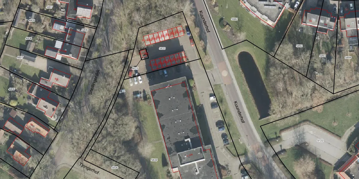 Het perceel waarop Kuunderhof 53 staat heeft een oppervlakte van 5622 m². Dit is een zeer groot perceel. De perceeloppervlakte wordt geregistreerd door het Kadaster. Gedetailleerde informatie over de maten van dit perceel kunt u vinden in het rapport Kadastrale kaart met maatvoering van Kuunderhof 53.
