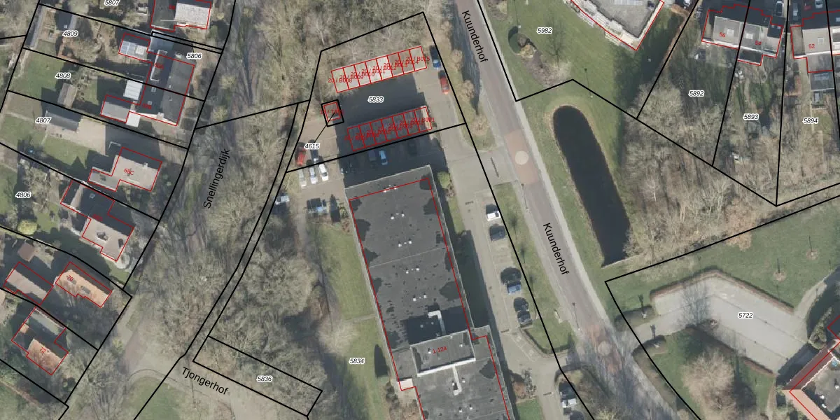 Het perceel waarop Kuunderhof 57 staat heeft een oppervlakte van 5622 m². Dit is een zeer groot perceel. De perceeloppervlakte wordt geregistreerd door het Kadaster. Gedetailleerde informatie over de maten van dit perceel kunt u vinden in het rapport Kadastrale kaart met maatvoering van Kuunderhof 57.