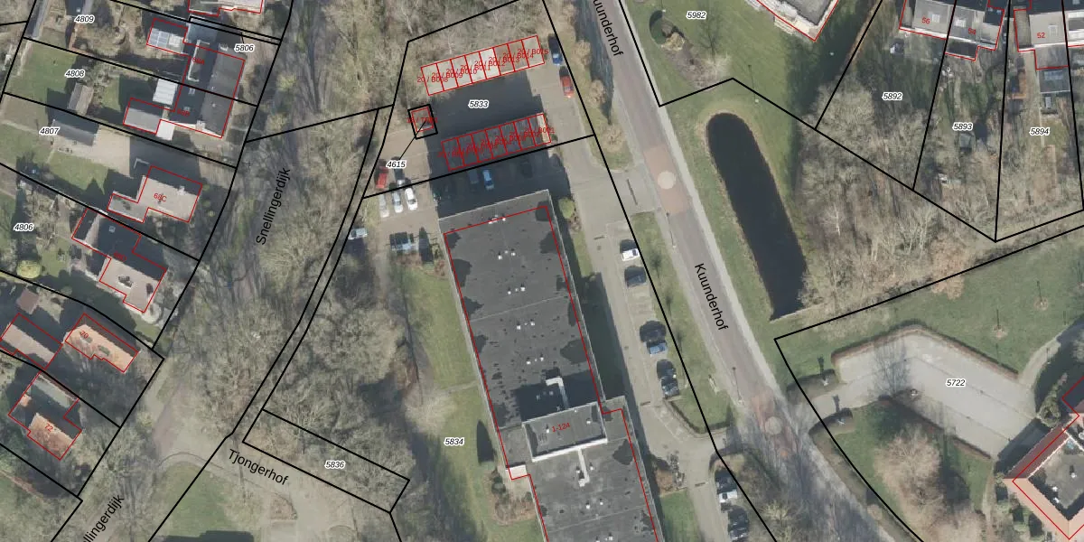 Het perceel waarop Kuunderhof 63 staat heeft een oppervlakte van 5622 m². Dit is een zeer groot perceel. De perceeloppervlakte wordt geregistreerd door het Kadaster. Gedetailleerde informatie over de maten van dit perceel kunt u vinden in het rapport Kadastrale kaart met maatvoering van Kuunderhof 63.