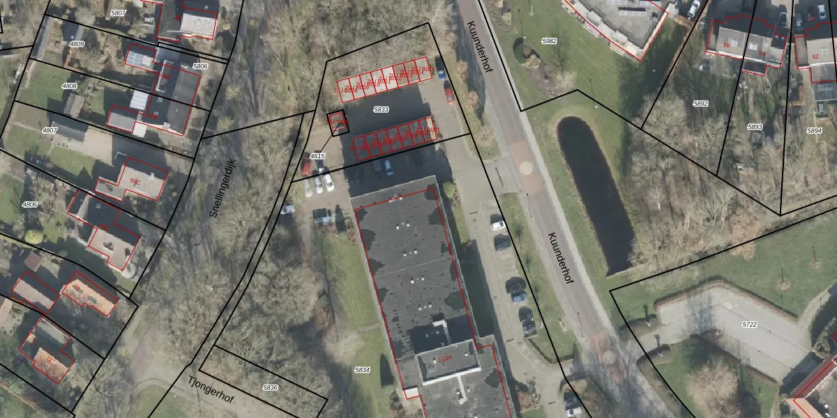 Het perceel waarop Kuunderhof 79 staat heeft een oppervlakte van 5622 m². Dit is een zeer groot perceel. De perceeloppervlakte wordt geregistreerd door het Kadaster. Gedetailleerde informatie over de maten van dit perceel kunt u vinden in het rapport Kadastrale kaart met maatvoering van Kuunderhof 79.