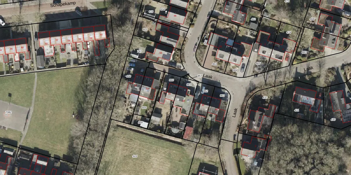 Het perceel waarop Laak 56 staat heeft een oppervlakte van 341 m². Dit is een groot perceel. De perceeloppervlakte wordt geregistreerd door het Kadaster. Gedetailleerde informatie over de maten van dit perceel kunt u vinden in het rapport Kadastrale kaart met maatvoering van Laak 56.