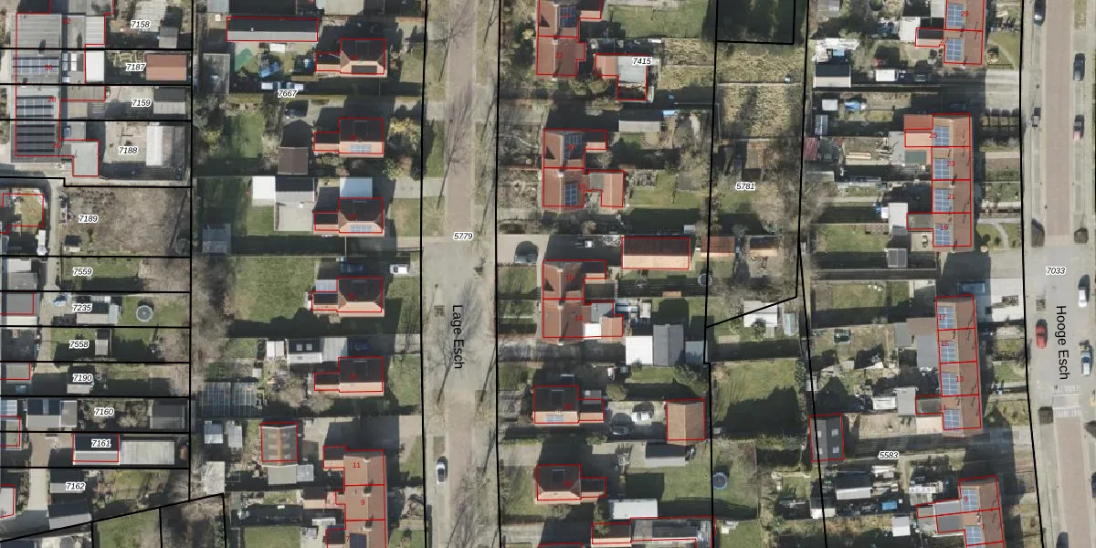 Het perceel waarop Lage Esch 16 staat heeft een oppervlakte van 6378 m². Dit is een zeer groot perceel. De perceeloppervlakte wordt geregistreerd door het Kadaster. Gedetailleerde informatie over de maten van dit perceel kunt u vinden in het rapport Kadastrale kaart met maatvoering van Lage Esch 16.