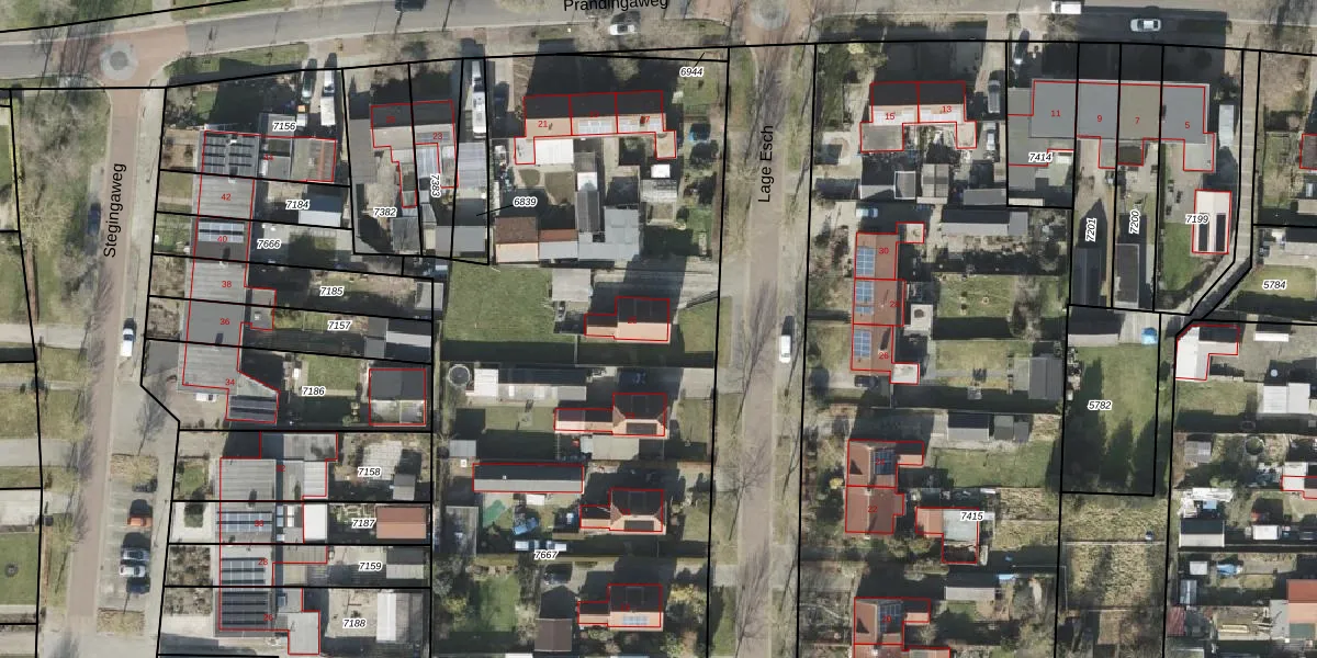 Het perceel waarop Lage Esch 25 staat heeft een oppervlakte van 7796 m². Dit is een zeer groot perceel. De perceeloppervlakte wordt geregistreerd door het Kadaster. Gedetailleerde informatie over de maten van dit perceel kunt u vinden in het rapport Kadastrale kaart met maatvoering van Lage Esch 25.