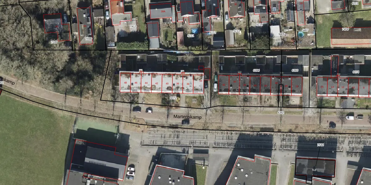Martenskamp 36 is gelegen op kadastraal perceel OTW02A6072. Deze kadastrale aanduiding is uniek en wordt gebruikt door het Kadaster om eigendomsrechten en andere zakelijke rechten vast te leggen. Het perceel maakt onderdeel uit van de kadastrale gemeente Oosterwolde.