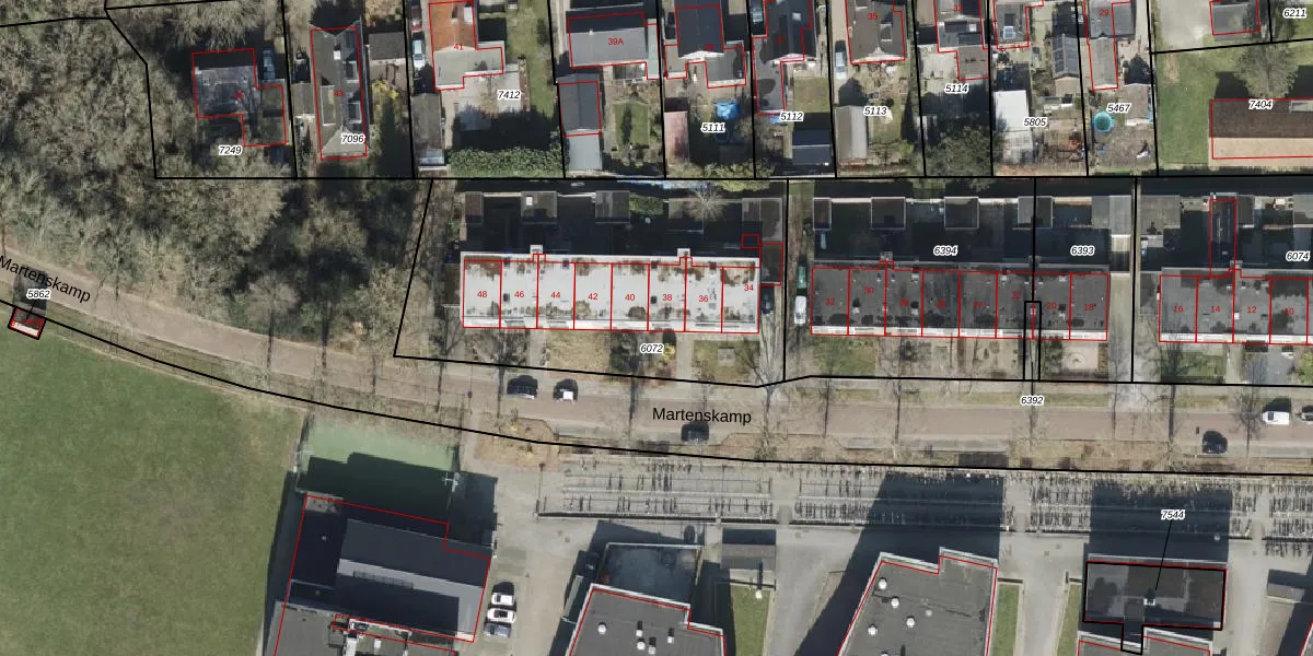 Het perceel waarop Martenskamp 38 staat heeft een oppervlakte van 1730 m². Dit is een zeer groot perceel. De perceeloppervlakte wordt geregistreerd door het Kadaster. Gedetailleerde informatie over de maten van dit perceel kunt u vinden in het rapport Kadastrale kaart met maatvoering van Martenskamp 38.