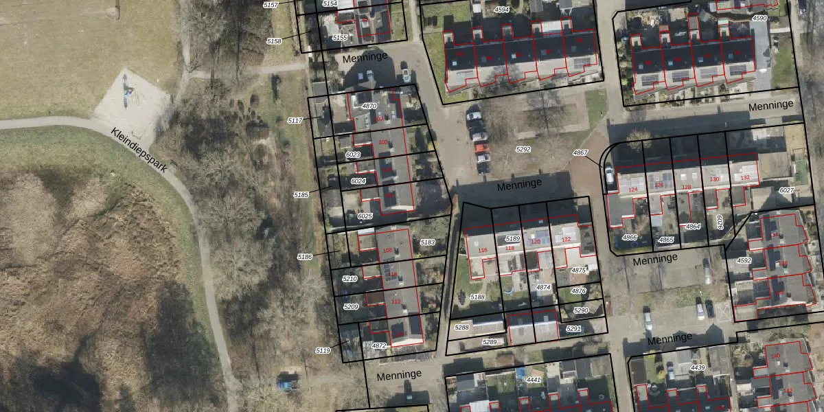 Menninge 106 is gelegen op kadastraal perceel OTW02C6025. Deze kadastrale aanduiding is uniek en wordt gebruikt door het Kadaster om eigendomsrechten en andere zakelijke rechten vast te leggen. Het perceel maakt onderdeel uit van de kadastrale gemeente Oosterwolde.