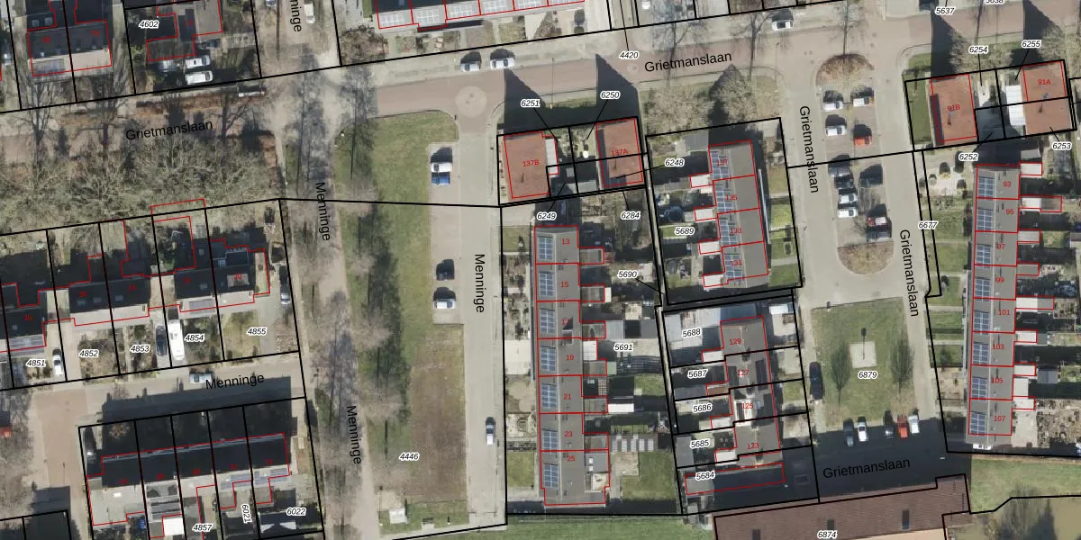 Menninge 15 is gelegen op kadastraal perceel OTW02C5691. Deze kadastrale aanduiding is uniek en wordt gebruikt door het Kadaster om eigendomsrechten en andere zakelijke rechten vast te leggen. Het perceel maakt onderdeel uit van de kadastrale gemeente Oosterwolde.