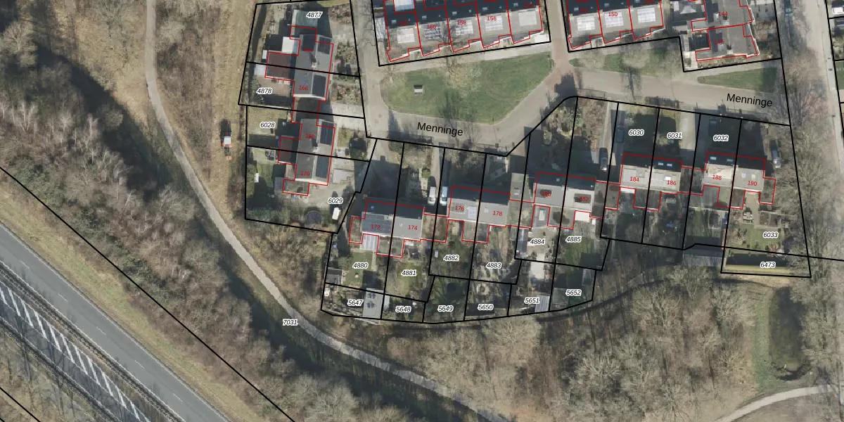 Het perceel waarop Menninge 174 staat heeft een oppervlakte van 362 m². Dit is een groot perceel. De perceeloppervlakte wordt geregistreerd door het Kadaster. Gedetailleerde informatie over de maten van dit perceel kunt u vinden in het rapport Kadastrale kaart met maatvoering van Menninge 174.