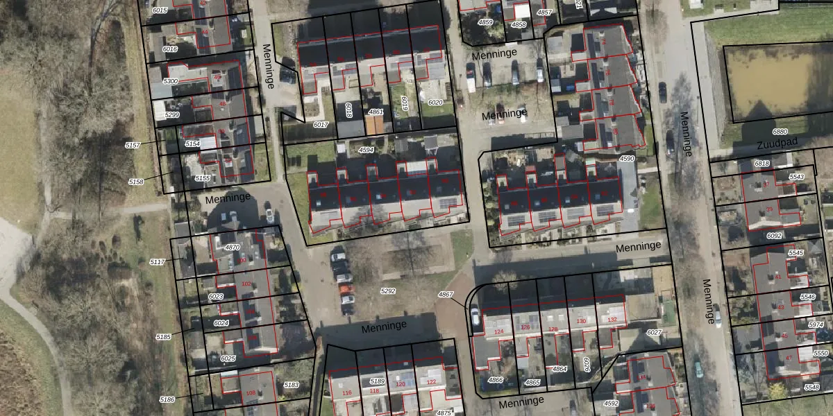 Menninge 92 is gelegen op kadastraal perceel OTW02C4594. Deze kadastrale aanduiding is uniek en wordt gebruikt door het Kadaster om eigendomsrechten en andere zakelijke rechten vast te leggen. Het perceel maakt onderdeel uit van de kadastrale gemeente Oosterwolde.