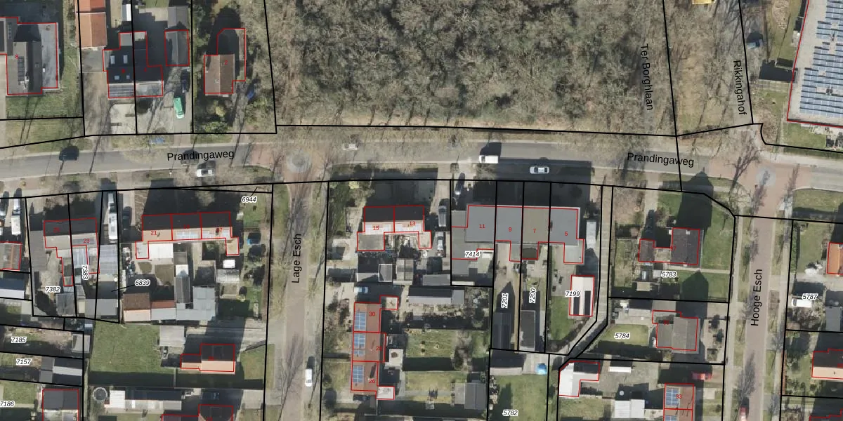 Prandingaweg 13 is gelegen op kadastraal perceel OTW02A7415. Deze kadastrale aanduiding is uniek en wordt gebruikt door het Kadaster om eigendomsrechten en andere zakelijke rechten vast te leggen. Het perceel maakt onderdeel uit van de kadastrale gemeente Oosterwolde.
