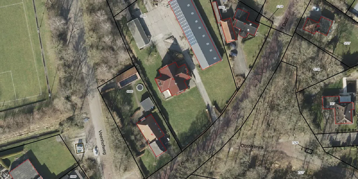 Het perceel waarop 't Oost 43 staat heeft een oppervlakte van 4060 m². Dit is een zeer groot perceel. De perceeloppervlakte wordt geregistreerd door het Kadaster. Gedetailleerde informatie over de maten van dit perceel kunt u vinden in het rapport Kadastrale kaart met maatvoering van 't Oost 43.