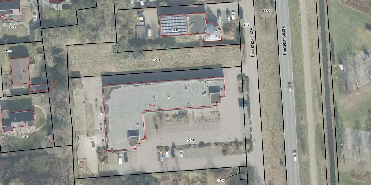Het perceel waarop Venekoterweg 54 staat heeft een oppervlakte van 5050 m². Dit is een zeer groot perceel. De perceeloppervlakte wordt geregistreerd door het Kadaster. Gedetailleerde informatie over de maten van dit perceel kunt u vinden in het rapport Kadastrale kaart met maatvoering van Venekoterweg 54.