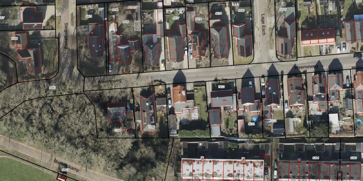 Weemeweg 41 is gelegen op kadastraal perceel OTW02A7412. Deze kadastrale aanduiding is uniek en wordt gebruikt door het Kadaster om eigendomsrechten en andere zakelijke rechten vast te leggen. Het perceel maakt onderdeel uit van de kadastrale gemeente Oosterwolde.