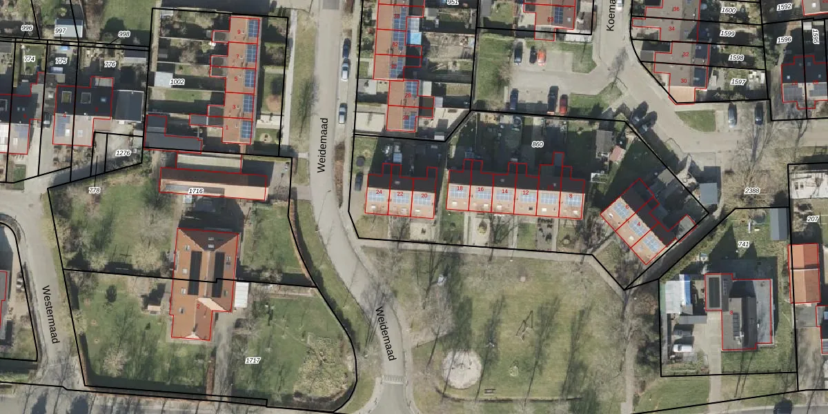 Het perceel waarop Weidemaad 20 staat heeft een oppervlakte van 2404 m². Dit is een zeer groot perceel. De perceeloppervlakte wordt geregistreerd door het Kadaster. Gedetailleerde informatie over de maten van dit perceel kunt u vinden in het rapport Kadastrale kaart met maatvoering van Weidemaad 20.