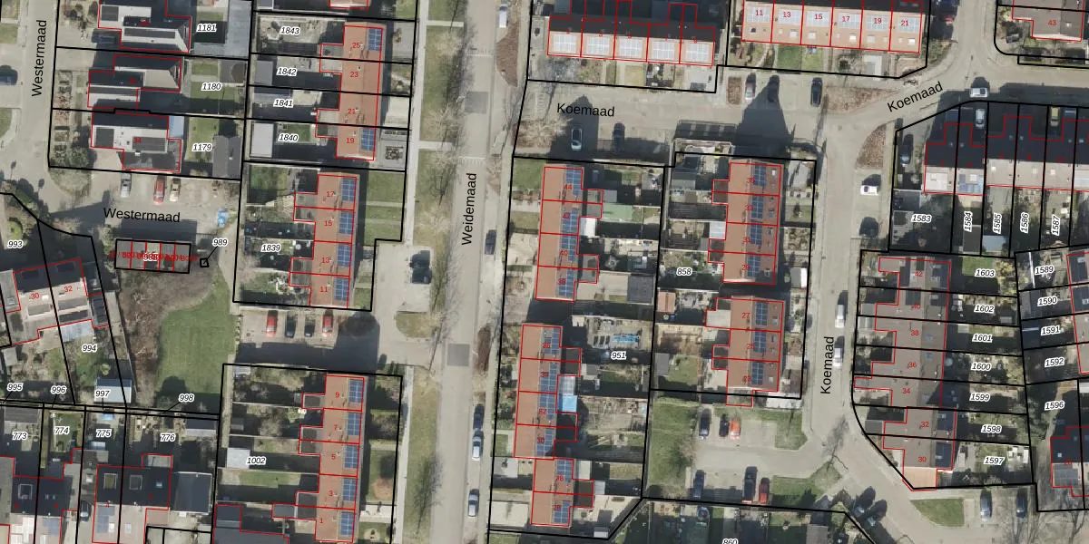 Het perceel waarop Weidemaad 38 staat heeft een oppervlakte van 1891 m². Dit is een zeer groot perceel. De perceeloppervlakte wordt geregistreerd door het Kadaster. Gedetailleerde informatie over de maten van dit perceel kunt u vinden in het rapport Kadastrale kaart met maatvoering van Weidemaad 38.