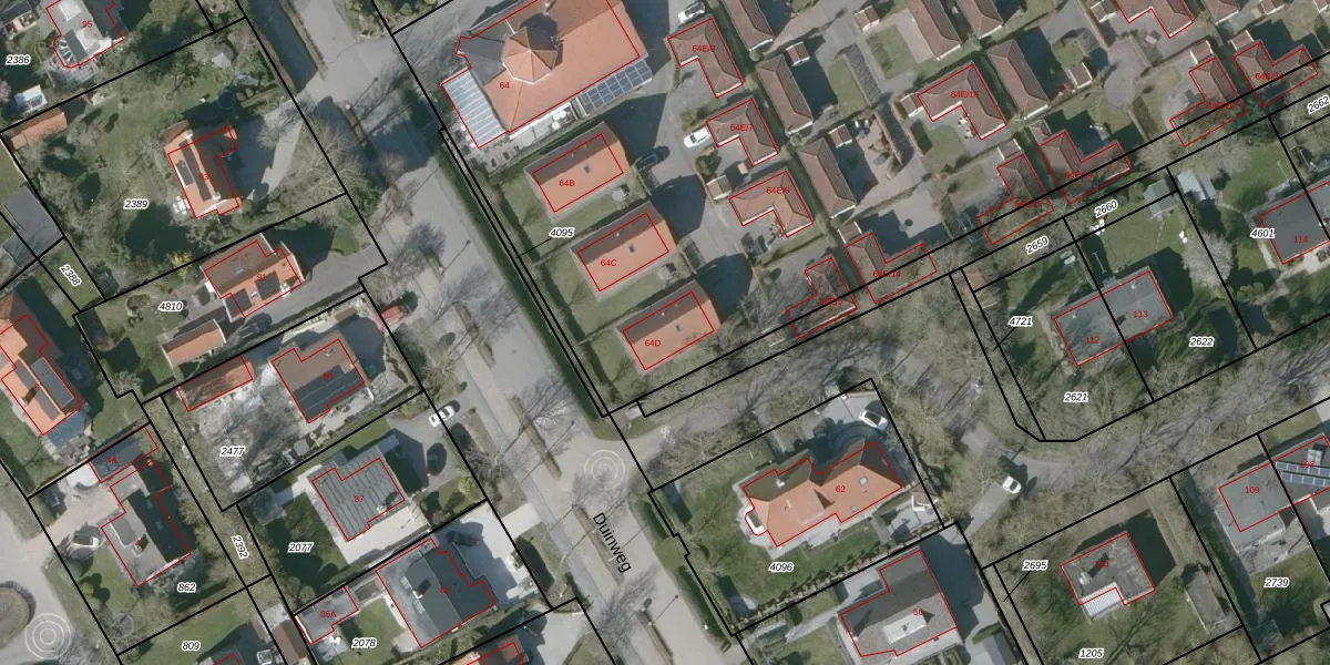 Het perceel waarop Duinweg 64-D staat heeft een oppervlakte van 1,6 ha. Dit is een zeer groot perceel. De perceeloppervlakte wordt geregistreerd door het Kadaster. Gedetailleerde informatie over de maten van dit perceel kunt u vinden in het rapport Kadastrale kaart met maatvoering van Duinweg 64-D.