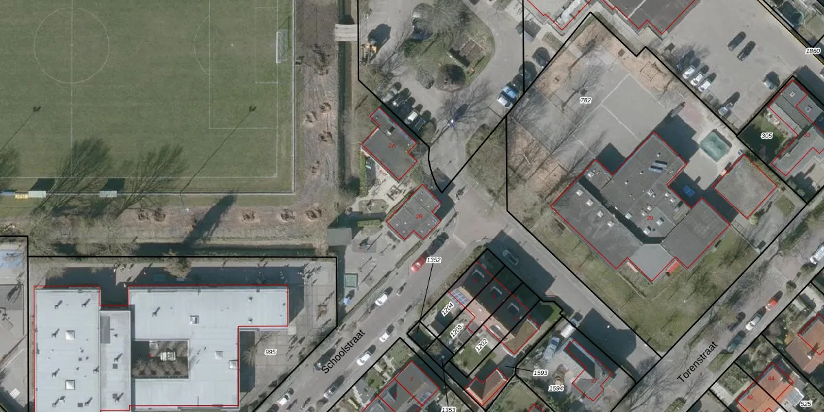 Het perceel waarop Schoolstraat 2-B staat heeft een oppervlakte van 4,9 ha. Dit is een zeer groot perceel. De perceeloppervlakte wordt geregistreerd door het Kadaster. Gedetailleerde informatie over de maten van dit perceel kunt u vinden in het rapport Kadastrale kaart met maatvoering van Schoolstraat 2-B.