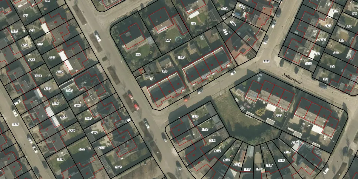 Het perceel waarop Jofferspas 34 staat heeft een oppervlakte van 1365 m². Dit is een zeer groot perceel. De perceeloppervlakte wordt geregistreerd door het Kadaster. Gedetailleerde informatie over de maten van dit perceel kunt u vinden in het rapport Kadastrale kaart met maatvoering van Jofferspas 34.
