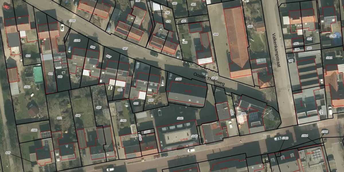 Ooster Thienweg 1-E is gelegen op kadastraal perceel VRY00S1569. Deze kadastrale aanduiding is uniek en wordt gebruikt door het Kadaster om eigendomsrechten en andere zakelijke rechten vast te leggen. Het perceel maakt onderdeel uit van de kadastrale gemeente Venray.