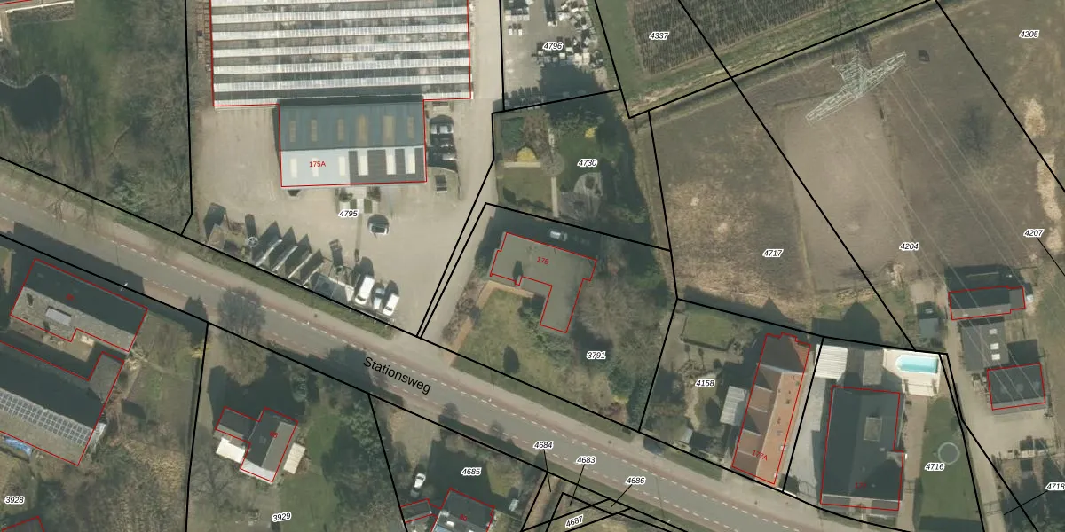Stationsweg 175 is gelegen op kadastraal perceel VRY00E3791. Deze kadastrale aanduiding is uniek en wordt gebruikt door het Kadaster om eigendomsrechten en andere zakelijke rechten vast te leggen. Het perceel maakt onderdeel uit van de kadastrale gemeente Venray.