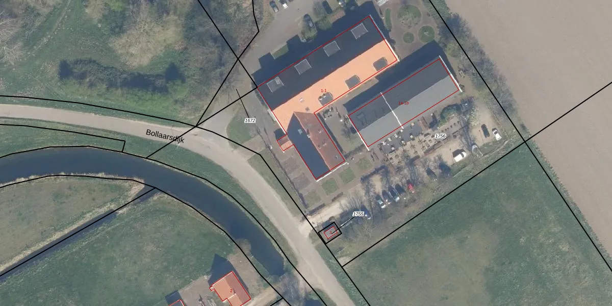 Het perceel waarop Bollaarsdijk 1-k03 staat heeft een oppervlakte van 6638 m². Dit is een zeer groot perceel. De perceeloppervlakte wordt geregistreerd door het Kadaster. Gedetailleerde informatie over de maten van dit perceel kunt u vinden in het rapport Kadastrale kaart met maatvoering van Bollaarsdijk 1-k03.