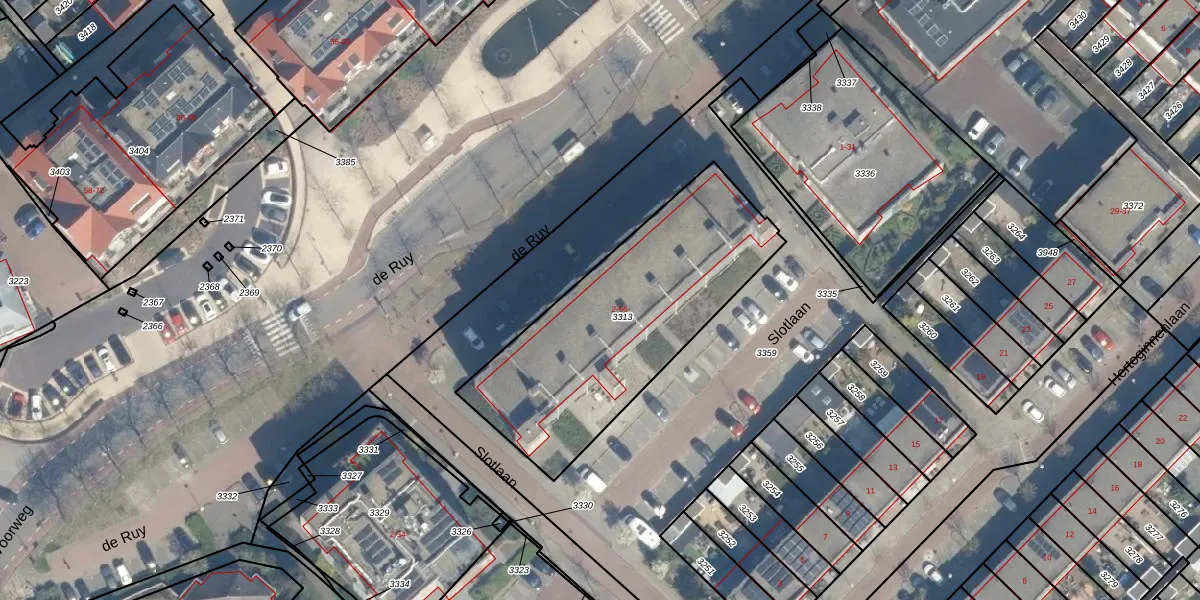 Het perceel waarop de Ruy 14 staat heeft een oppervlakte van 1135 m². Dit is een zeer groot perceel. De perceeloppervlakte wordt geregistreerd door het Kadaster. Gedetailleerde informatie over de maten van dit perceel kunt u vinden in het rapport Kadastrale kaart met maatvoering van de Ruy 14.