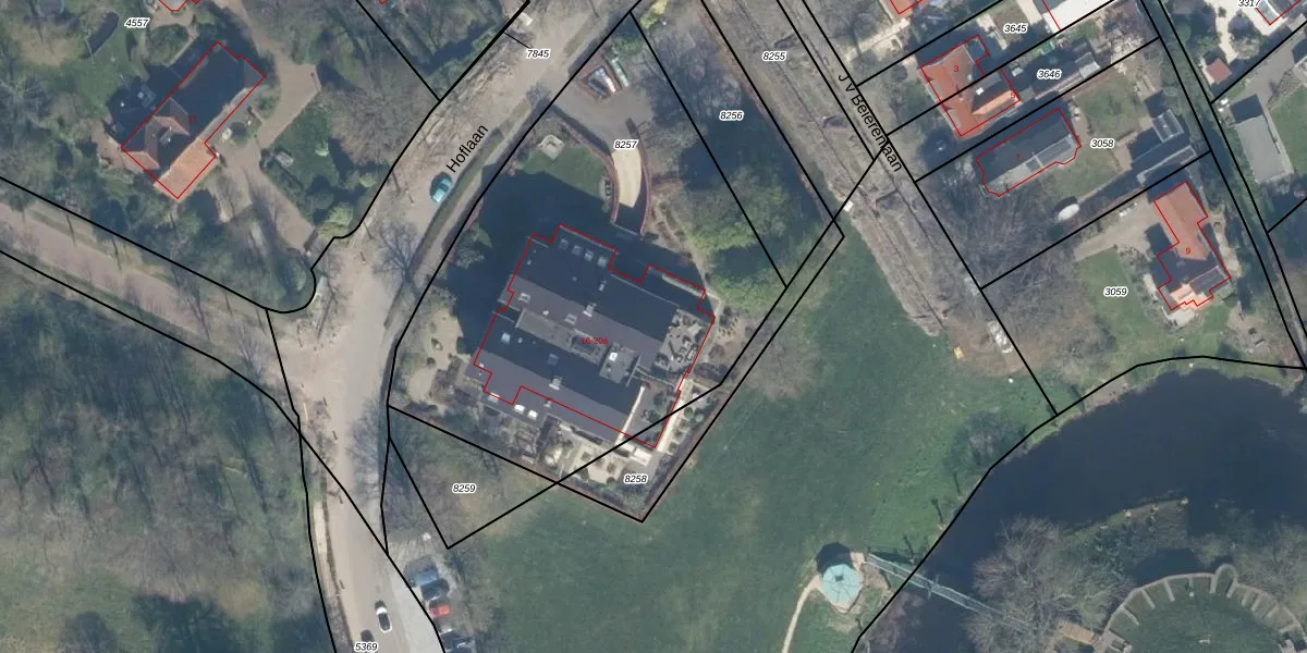 Het perceel waarop Hoflaan 16 staat heeft een oppervlakte van 2410 m². Dit is een zeer groot perceel. De perceeloppervlakte wordt geregistreerd door het Kadaster. Gedetailleerde informatie over de maten van dit perceel kunt u vinden in het rapport Kadastrale kaart met maatvoering van Hoflaan 16.