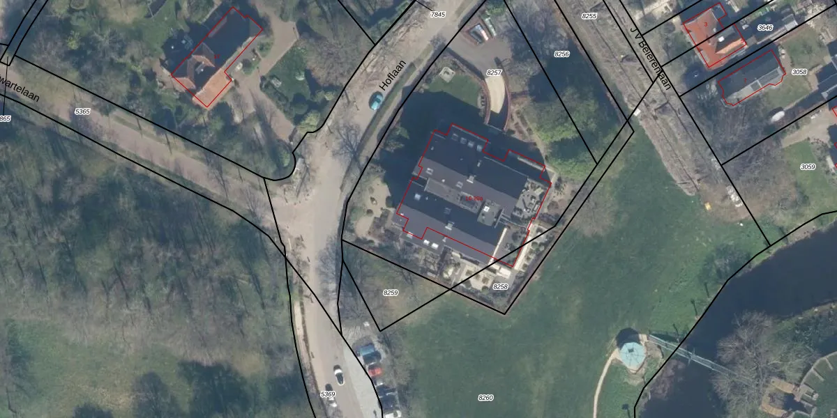 Het perceel waarop Hoflaan 18-b staat heeft een oppervlakte van 2410 m². Dit is een zeer groot perceel. De perceeloppervlakte wordt geregistreerd door het Kadaster. Gedetailleerde informatie over de maten van dit perceel kunt u vinden in het rapport Kadastrale kaart met maatvoering van Hoflaan 18-b.