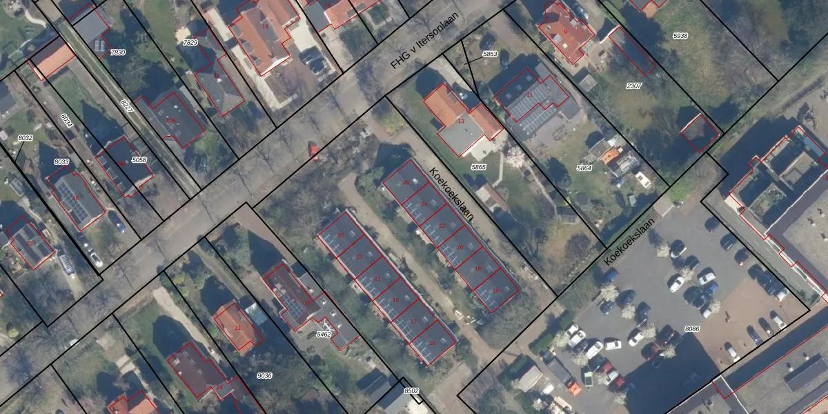 Het perceel waarop Koekoekslaan 24 staat heeft een oppervlakte van 2,6 ha. Dit is een zeer groot perceel. De perceeloppervlakte wordt geregistreerd door het Kadaster. Gedetailleerde informatie over de maten van dit perceel kunt u vinden in het rapport Kadastrale kaart met maatvoering van Koekoekslaan 24.