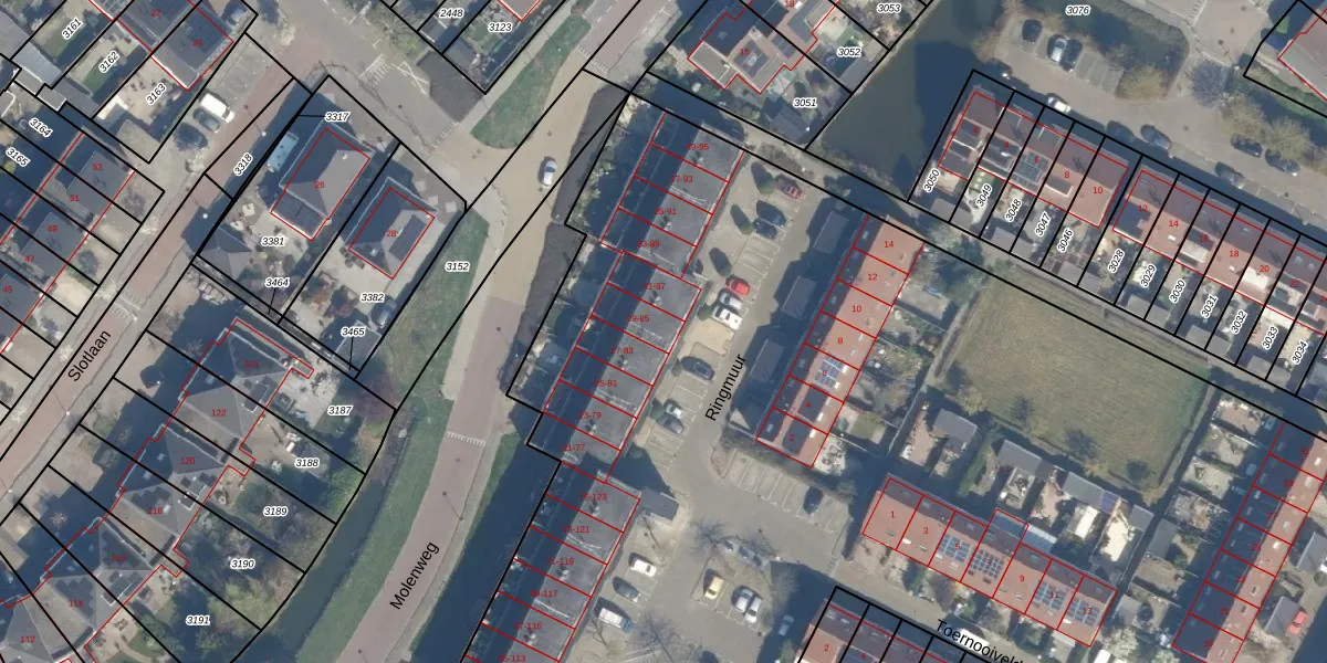 Het perceel waarop Ringmuur 29 staat heeft een oppervlakte van 1,3 ha. Dit is een zeer groot perceel. De perceeloppervlakte wordt geregistreerd door het Kadaster. Gedetailleerde informatie over de maten van dit perceel kunt u vinden in het rapport Kadastrale kaart met maatvoering van Ringmuur 29.